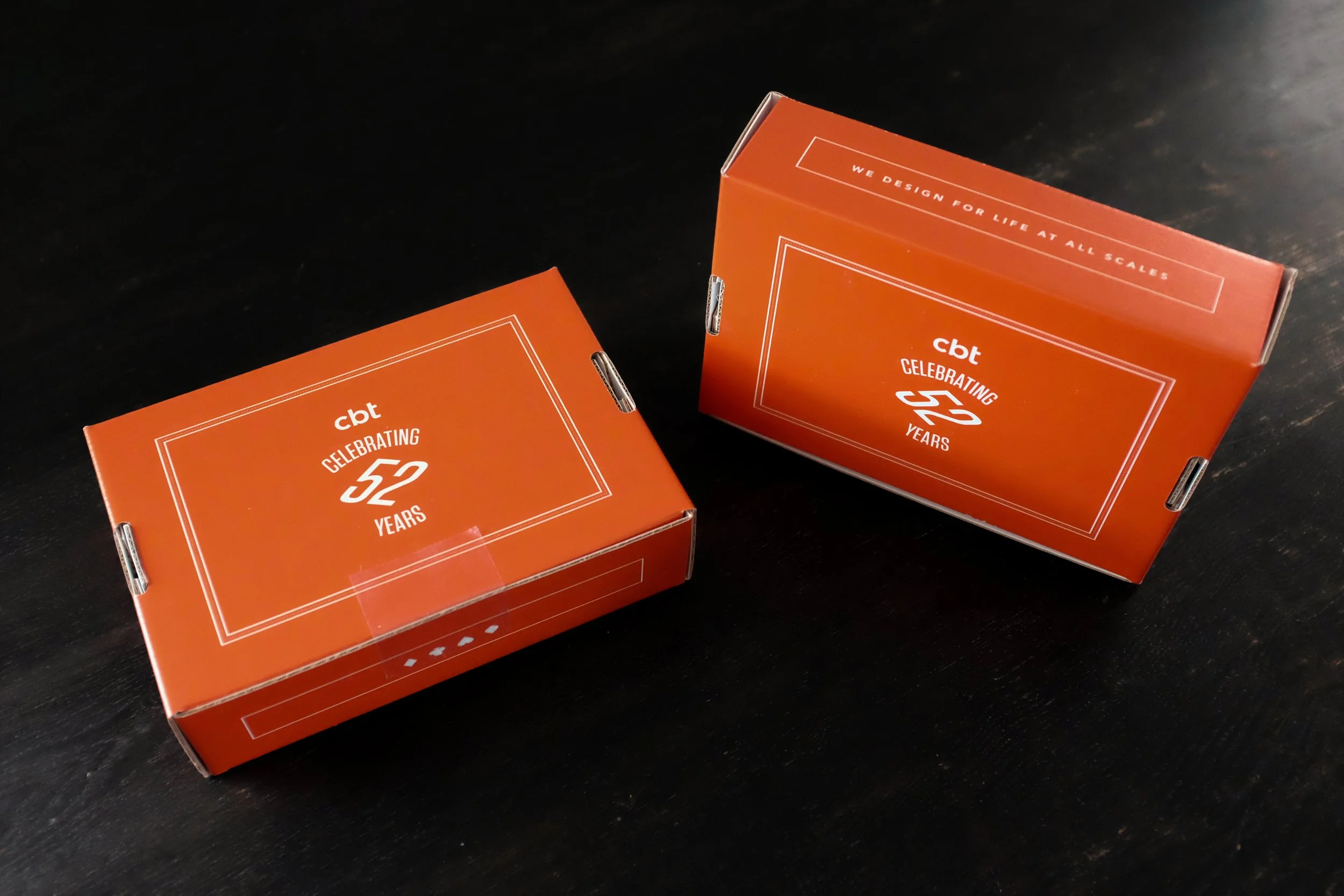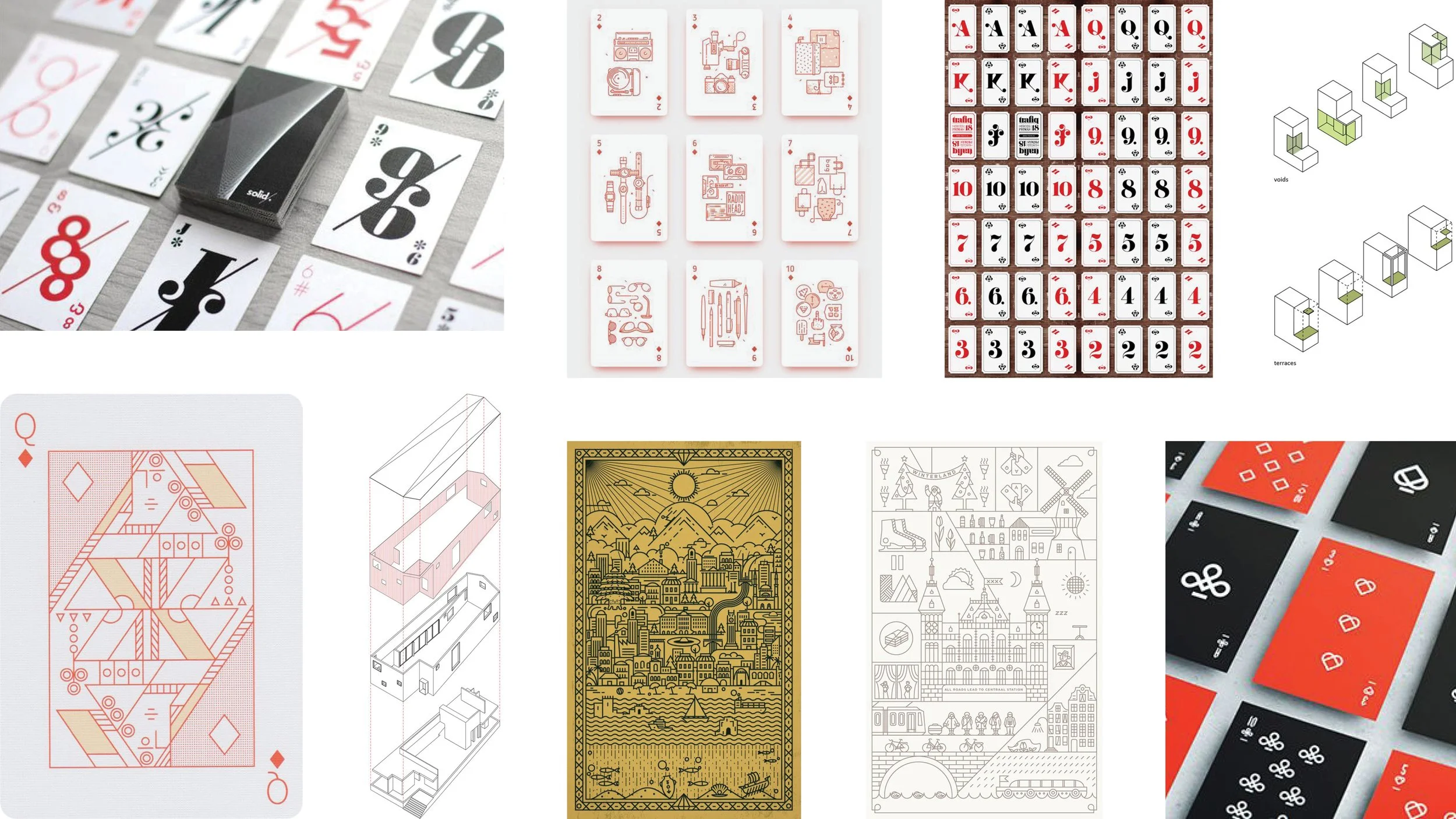 A custom deck of playing cards and mailer boxes designed as a holiday client gift for CBT’s 52nd year. Isometric typography and exploded faces give an architectural and diagrammatic feel. Details stay true to the history of playing card design including one eyed and right-facing royals subtly represented by one exploded layer and flipped typographic figures.